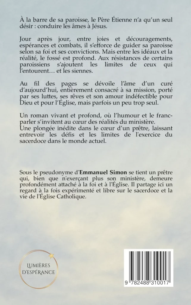 Ce roman vivant et profond, touchant par sa sincérité est inspiré par une expérience réelle personnelle. Car sous le pseudonyme d’Emmanuel Simon se tient un prêtre catholique qui, bien que n’exerçant plus son ministère aujourd’hui, demeure profondément attaché à la foi chrétienne et à l’Église. Il livre dans ce roman un regard aussi libre qu’expérimenté sur le sacerdoce et la vie de l’Église Catholique. Sans jamais tomber dans la critique, ce roman invite à réfléchir aux limites de l’exercice du sacerdoce dans la situation actuelle.